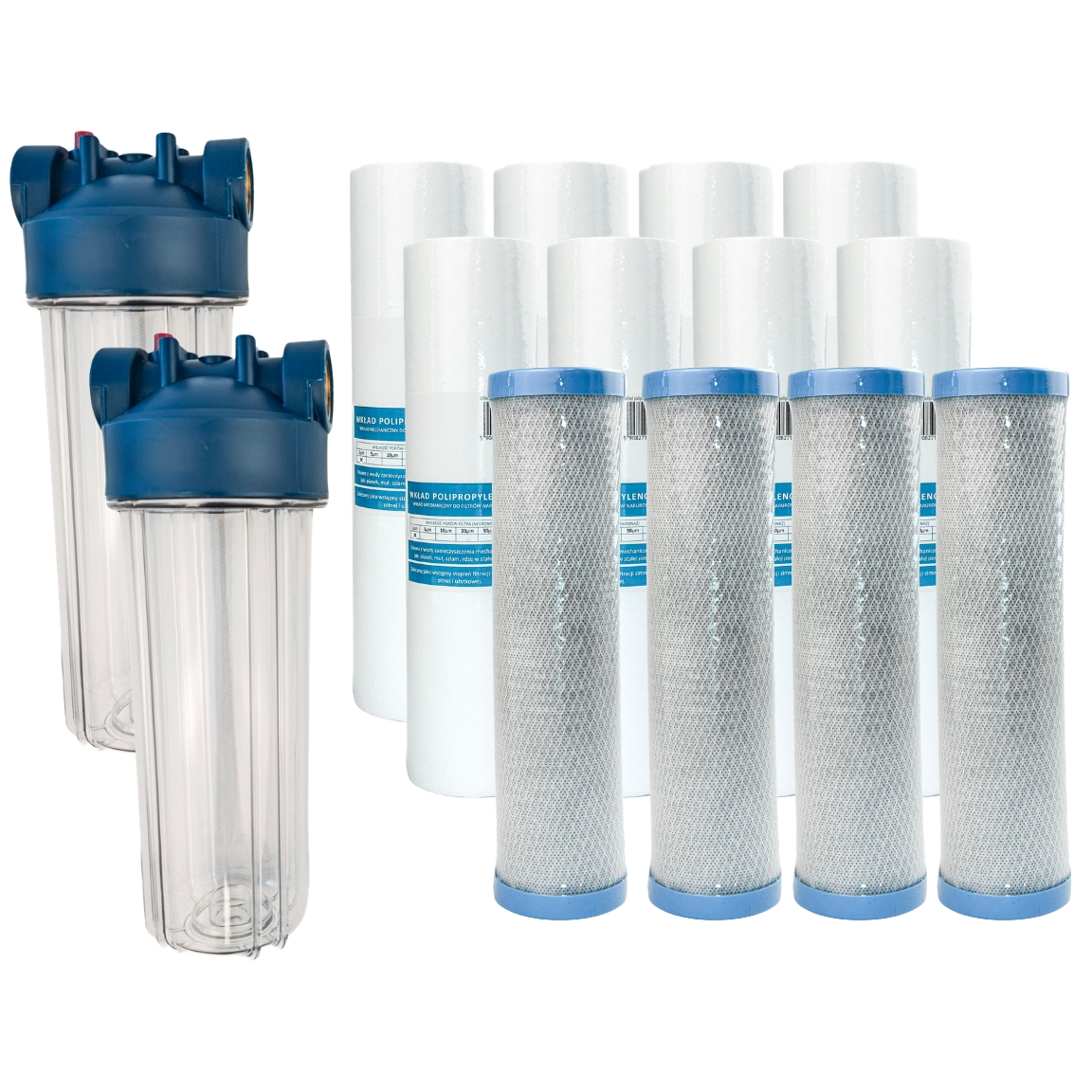 - zapas wkładów wymiennych do podwójnej stacji filtracyjnej (8 wkładów piankowych 20 mik. i 4 wkłady z węgla aktywnego) – zalecana wymiana wkładów co 6 miesięcy